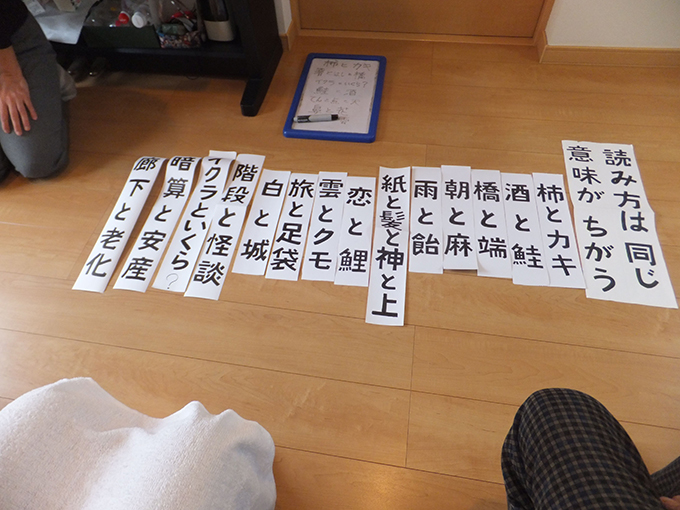 先生が98歳の方が作られた船頭さんの折り紙を持ってきてくださり、皆様驚きながら手に取って眺めておられました。また、同じ言葉で意味が違うものなどを皆でうんうん唸りながら考えたりしました。