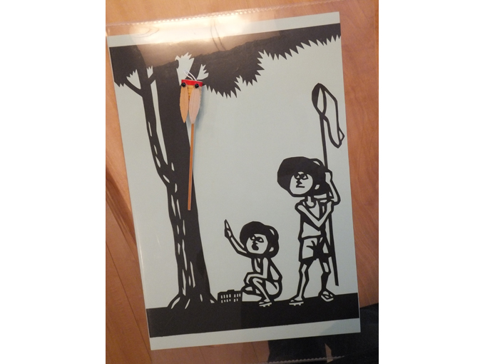 2012年8月16日 新しいご利用者様が加わり、にぎやかになりました。 竹の蝉は糸の先の竹コマをまわすと、蝉の声がしました。影絵も見せていただき、子供のころの遊びの話などにも花が咲きました。