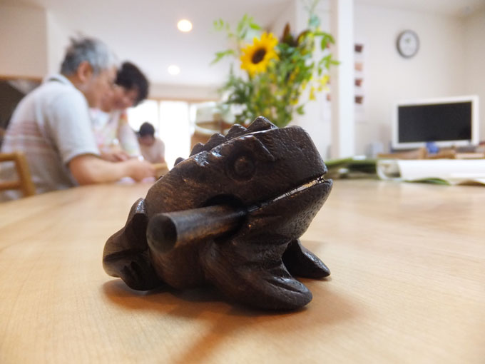 2012年6月8日 梅雨入り宣言にともない、オープニングは”カエルの唄”で始まりました。 先生ご持参の木彫りのカエルは、背中の波型をこするとカエルの鳴き声がして大きさや木の種類によっても音色のちがいがあり、皆さん珍しさもあってか何度もこすっておられました。