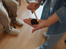 しかし、「雨」の歌は多く、雨降りお月さんや長崎は今日も雨だったなど他にも色々な雨の曲を歌いました。 他には先生が持ってきてくださった、カエルの鳴き声がする楽器を鳴らしながらカエルの歌やでんでん虫を手で作りながら、歌を歌ったりしました。